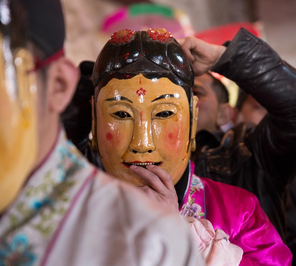画面定格了傩戏演出前的准备瞬间,粉衣与古拙的傩面相映,手指轻触面具的动作充满仪式感,既展现了传统民俗的鲜活传承,也传递出表演者对这一古老技艺的敬畏与珍视。