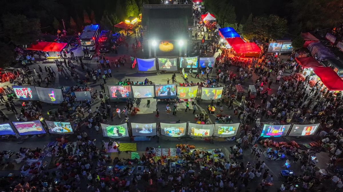 俯瞰视角更显规模:多块大屏幕组成露天剧场,中式建筑在强光灯下宛如戏台,警车红蓝灯与摊位帐篷构成流动的色彩。建议取名《戏火流光》,既突出戏曲表演(戏)与烟花篝火(火)的交融,又体现传统艺术(戏文)与现代技术(电子屏)在光影(流光)中的传承。