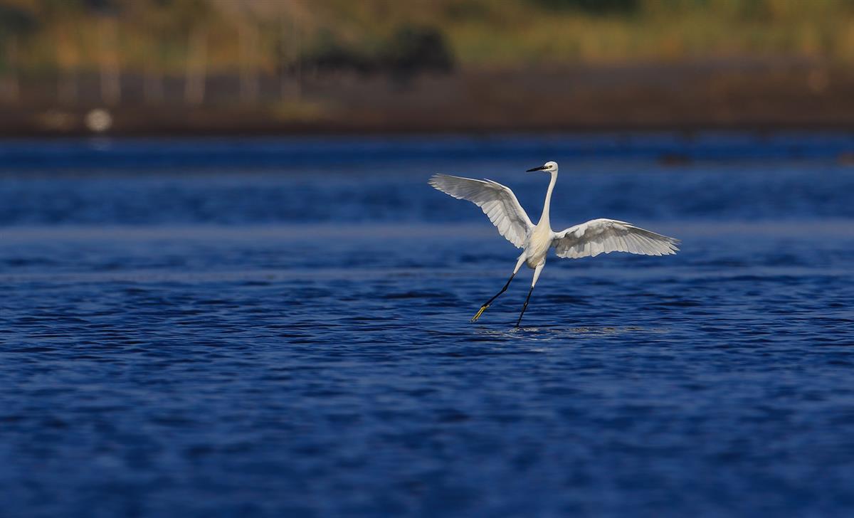 一只白鹭在湿地的水面展开翅膀,就像是在独自舞蹈