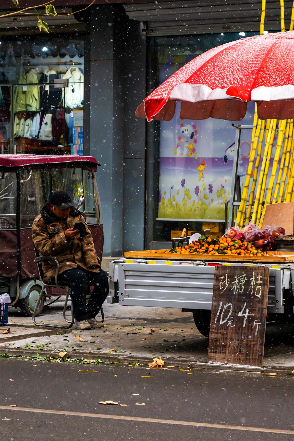 2026年1月15日傍晚,河北省石家庄市平山县城雪一直在下,路边一位果农继续摆着水果摊,虽然天快黑了,下着雪也没有生意,但他依然冒着零下10度的严寒,在雪中坚守着,快过年了,钱不好赚,孩子需要交学费,家里需要过年花钱。