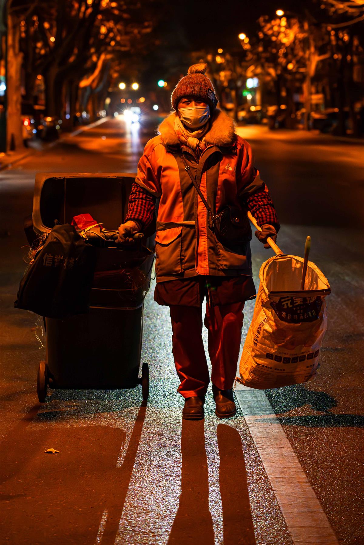 2026年1月22日5点,河北省石家庄市平山县县城,天还未亮,街头最忙碌的是环卫工人,一位环卫女工一手拉着垃圾桶,一手拿着垃圾袋,后面的车灯映衬着她身影特别的美,辛苦我一个幸福千万家,她的身影平凡而伟大