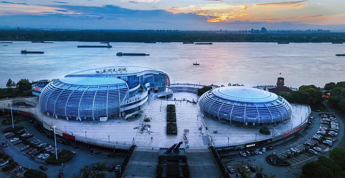 《双穹映江》2025年9月10日航拍于芜湖滨江公园。芜湖大剧院以双穹顶的流线型姿态临江而立。建筑依江而筑,与江面的波光、落日余晖相映成趣。曲线的穹顶打破了城市的直线轮廓,让冰冷的建筑材料有了流动的诗意,成为江城芜湖天际线中极具辨识度的美学符号。