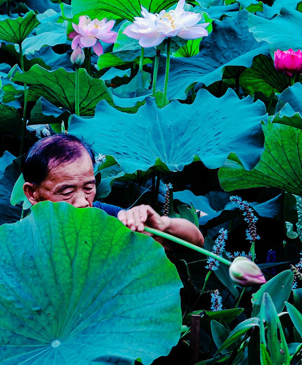 荷花塘里荷花盛开,养荷大爷深入塘中打理荷花,大爷与荷花一样焕发着生机活力。