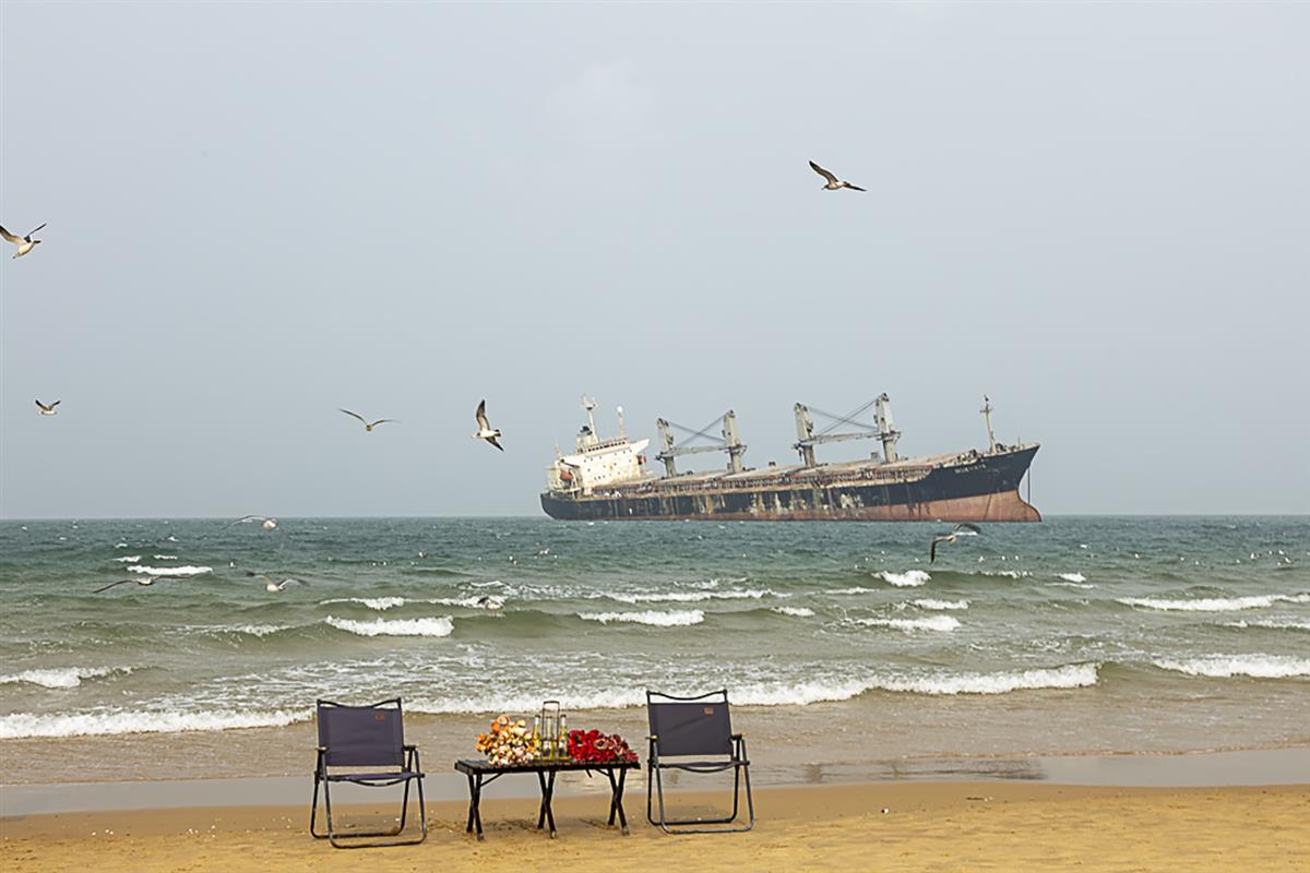沙滩上,两把折叠椅相对而坐,小桌摆着鲜花与果盘,像是一场为大海和旧船准备的静谧野餐。远处,锈迹斑驳的“布鲁维斯号”巨轮搁浅在海浪里,与翻涌的浪花、低飞的海鸥构成一幅沧桑又温柔的画面。海雾弥漫的天空让整个场景自带一层朦胧滤镜,工业遗迹的荒凉与人间烟火的浪漫在此刻完美交融,仿佛时间也在此刻为这片搁浅的风景停驻。
