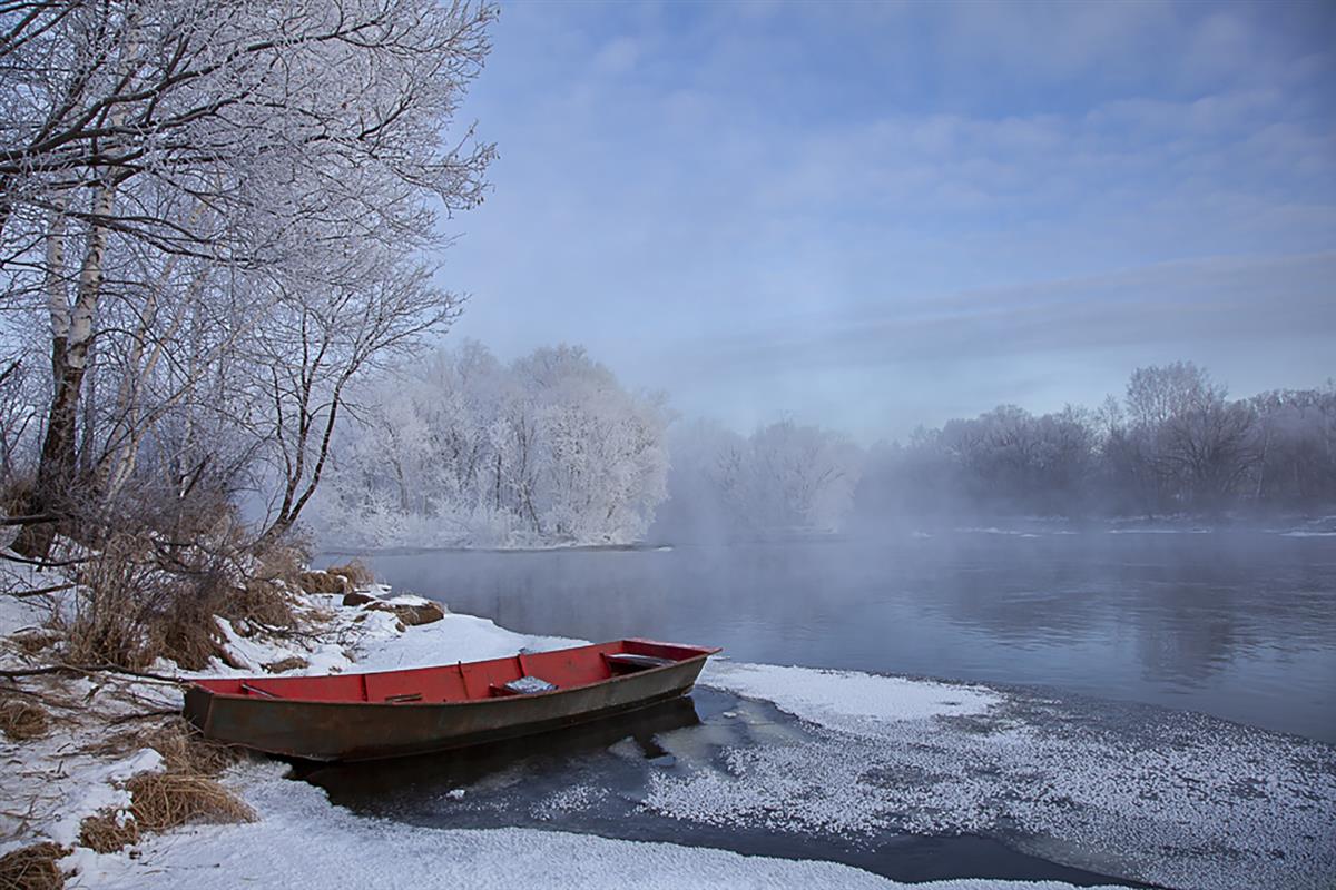 晨雾如纱轻覆半凝的冰河,两岸雾凇凝作琼枝玉树。一艘红舟静泊于冰流之间,承“野渡无人舟自横”的悠然意境,在清冷蓝白的天地里,以一抹炽热朱红点亮了冬日晨景的诗意。
