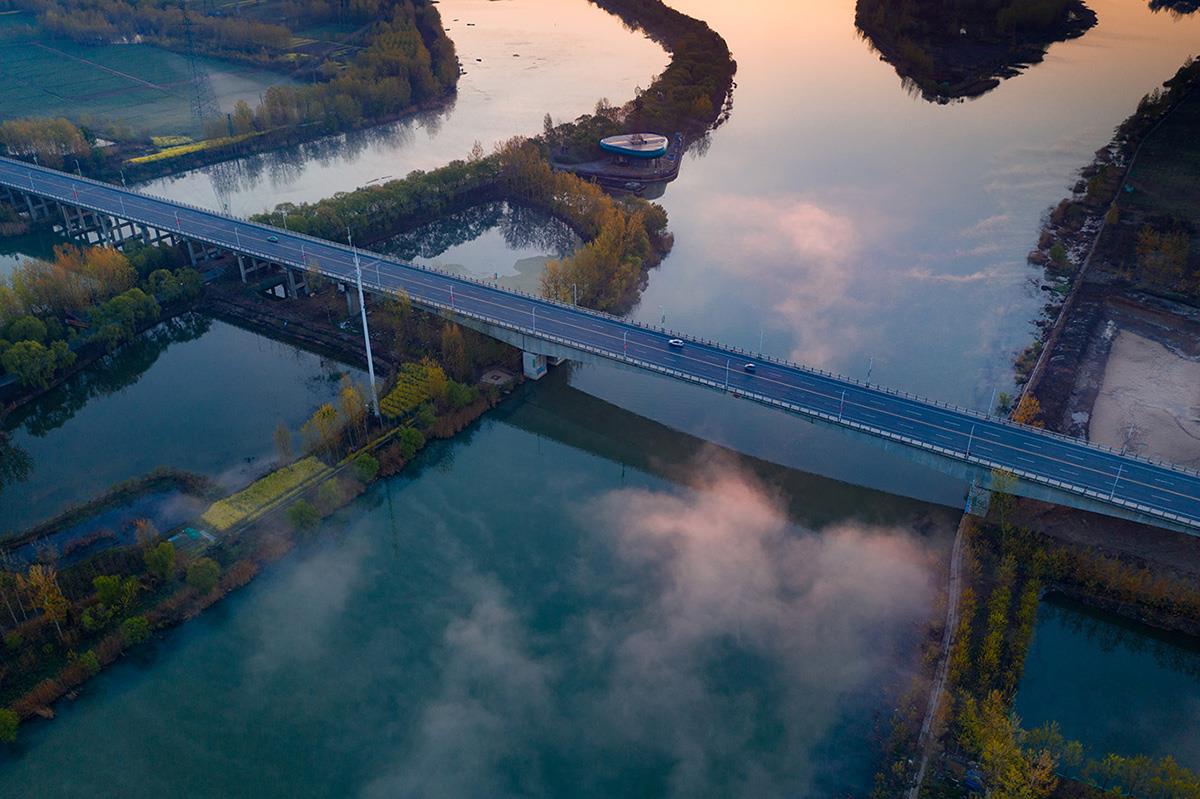 一朝霞色笼烟渚,半桥晨光照古桥,水天一色,晨景自娇。