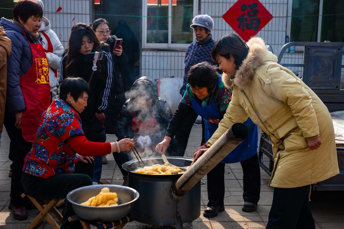 2026年1月26日,河北省平山县宅北乡碾盘沟村,这里是抗战时期《晋察冀画报》的创刊地,也是沙飞等红色摄影家战斗过的地方,早上起来乡亲们自办了热闹的年味节,写对联、挂灯笼,杀猪煮肉做腌肉、灌肉肠,合面做年糕、炸麻糖,泡豆做豆腐等等当地特色的年味制作活动,浓浓的年味儿洋溢在乡亲们的脸上,图为乡亲们正在炸油饼