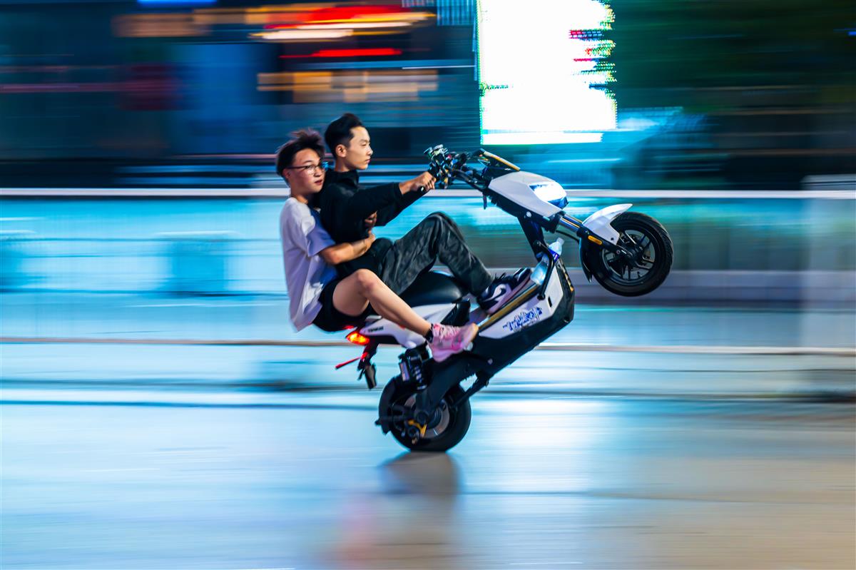 2025年8月19日午夜0点,河北省石家庄市平山县县城,正在参加北京摄影函授学院学习的作者拍摄线条作业回家的路上,用慢门拍摄了一组午夜街头的摇拍作品,刚下晚班的小女孩、刚下夜自习的女学生、骑共享电车遛狗的女孩、骑车飞驰的小青年、快递小哥们忙碌的身影。。等等构成了一幅幅时代的生活画卷,图为在飙车技的两个小伙子