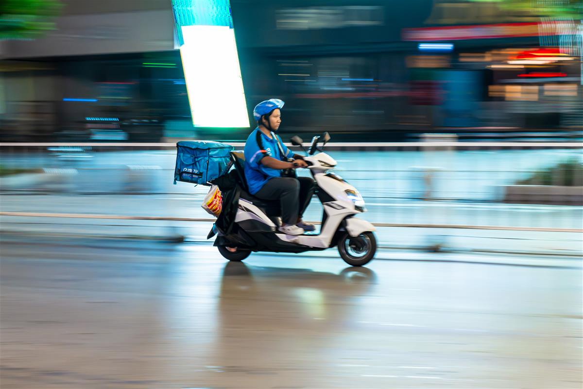 2025年8月19日午夜0点,刚刚雨后的河北省石家庄市平山县县城,正在参加北京摄影函授学院学习的作者拍摄线条作业回家的路上,用慢门拍摄了一组午夜街头的摇拍作品,刚下晚班的小女孩、刚下夜自习的女学生、骑共享电车遛狗的女孩、骑车飞驰的小青年、快递小哥们忙碌的身影。。等等构成了一幅幅时代的生活画卷,图为正在忙着送单的快递小哥