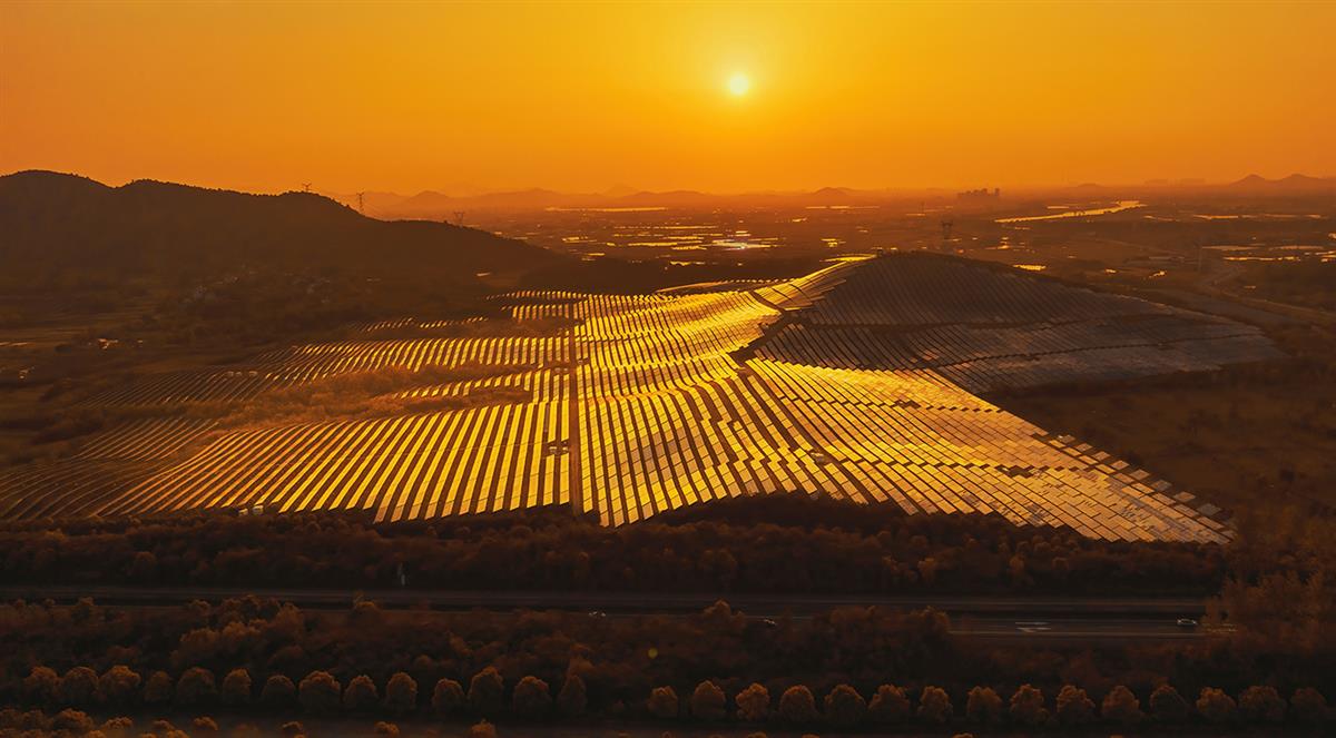 《光田染金辉》2023年4月20日航拍于芜湖市弋江区455省道与响水涧公路交叉口。落日融金,漫洒在连绵的光伏板上,将整片“光田”染成璀璨金辉。整齐的阵列如大地铺展的金色鳞片,在暮色中熠熠生辉。晚风轻拂,自然的暖光与科技的力量在此相融,让清洁能源的诗意在山河间静静流淌。