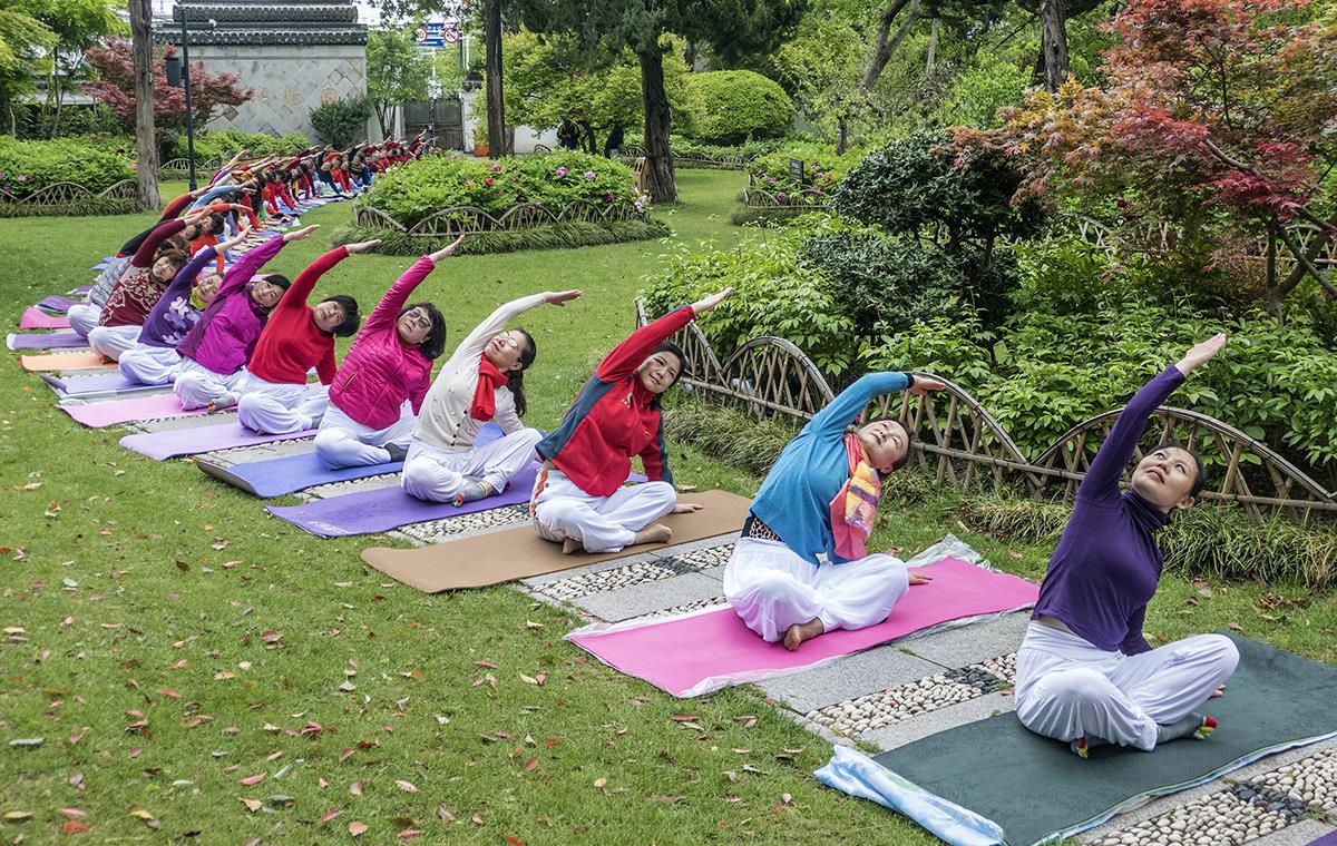 一群充满活力的老年人,以瑜伽表演展示着健康的美丽。