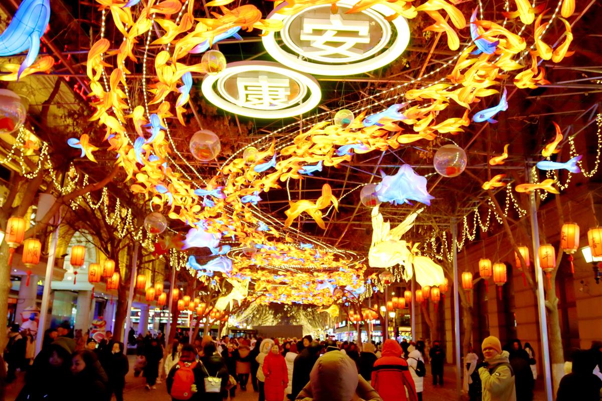 哈尔滨市中央大街步行街始建于1898年,是全国第一条商业步行街。2025年2月8日,熙熙攘攘的游人观赏着街上新安装的大型彩灯。