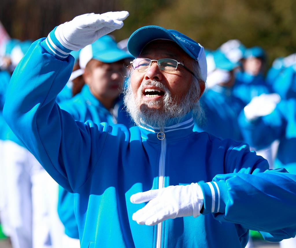 一位精神矍铄的老人和队友充满激情跳广场舞。