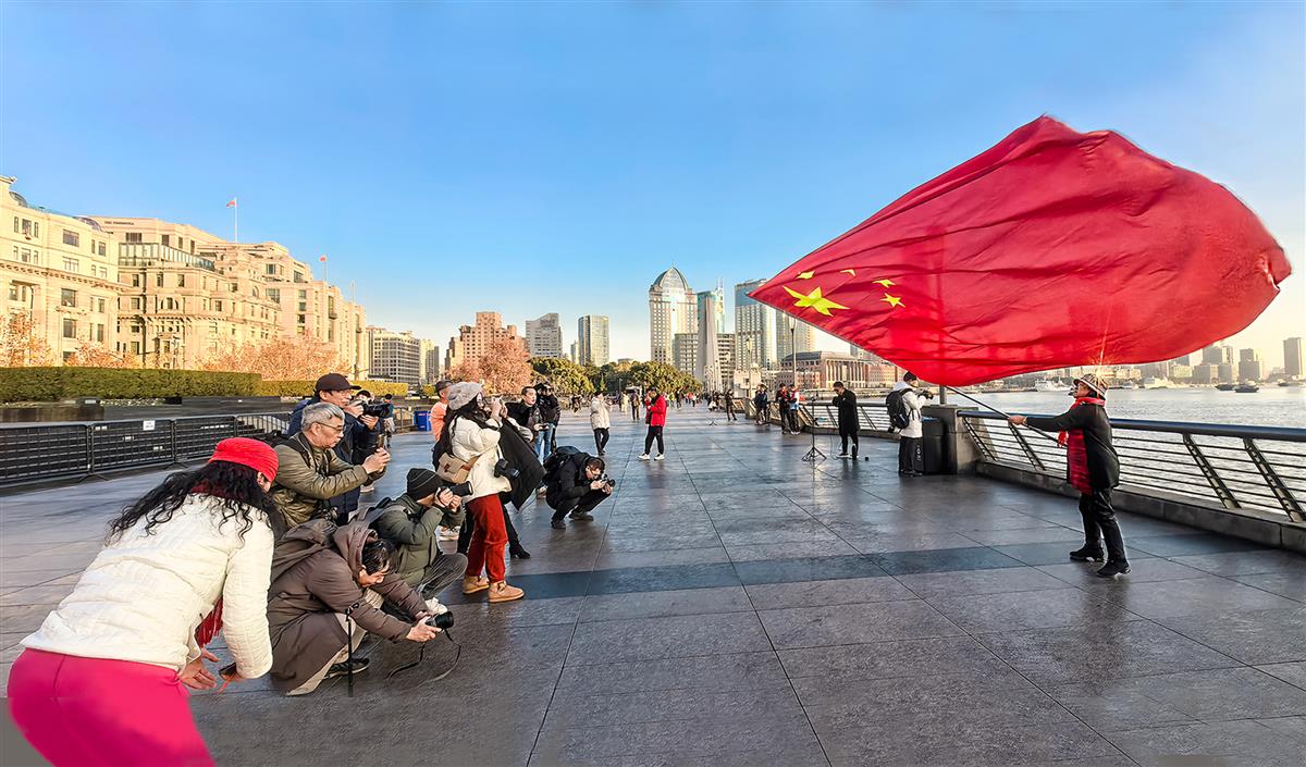 2025年元旦,专程赶到外滩迎接新年的晨练者展开国旗迎风挥舞。