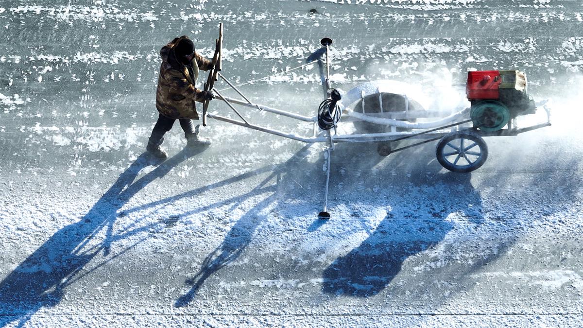 寒风刺骨的松花江冰面上,切冰工匠正操作设备切冰......