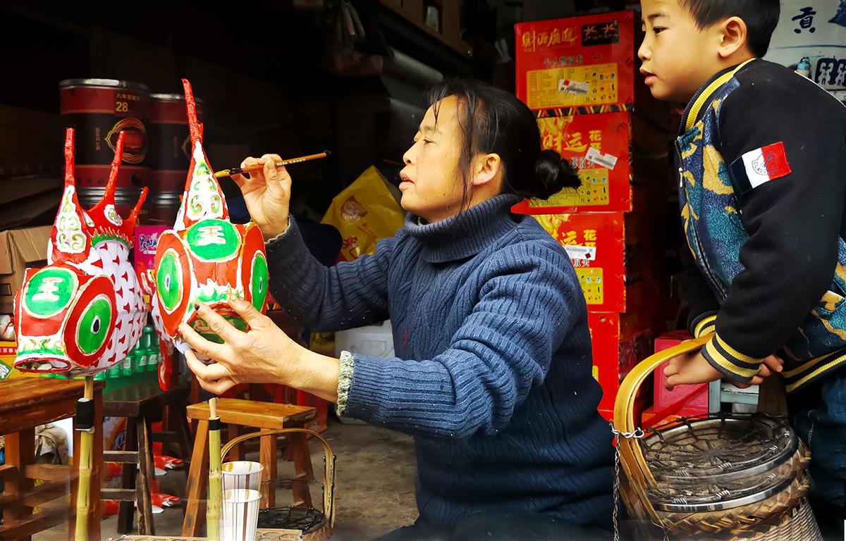 元宵节期间,汪满田村村民家家户户都会制作嬉鱼灯,小店女主人在给小嬉鱼灯上色时,儿子在旁仔细观摩学习。