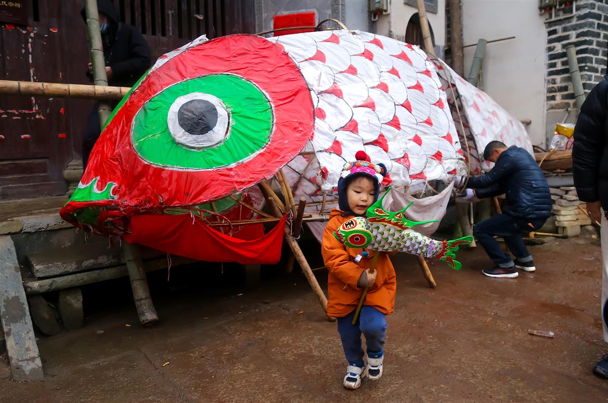 元宵佳节期间,汪满田村家家户户都会制作嬉鱼灯,儿童们手持小小嬉鱼灯在大人们制作的嬉鱼灯前玩耍。