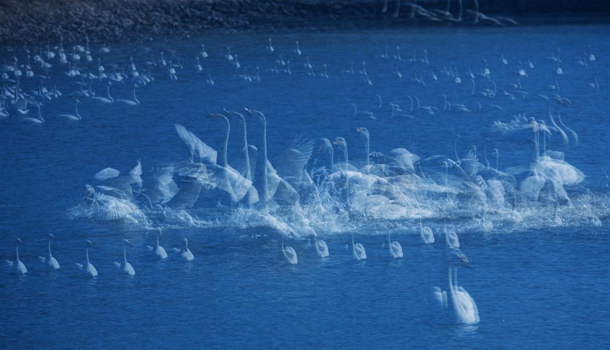 群鸿踏浪而来,白羽舒展,舞姿翩跹,或振翅掠波,或嬉水相逐,翅尖轻挑涟漪,清影交织成画。
