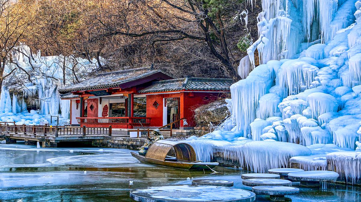 2026年1月24日,济南灵岩寺景区。群山环抱中的灵岩寺,冰瀑为崖壁覆上白纱,红亭、木桥与半冻的湖水相映成趣,这是独属于古刹的冬日韵味。