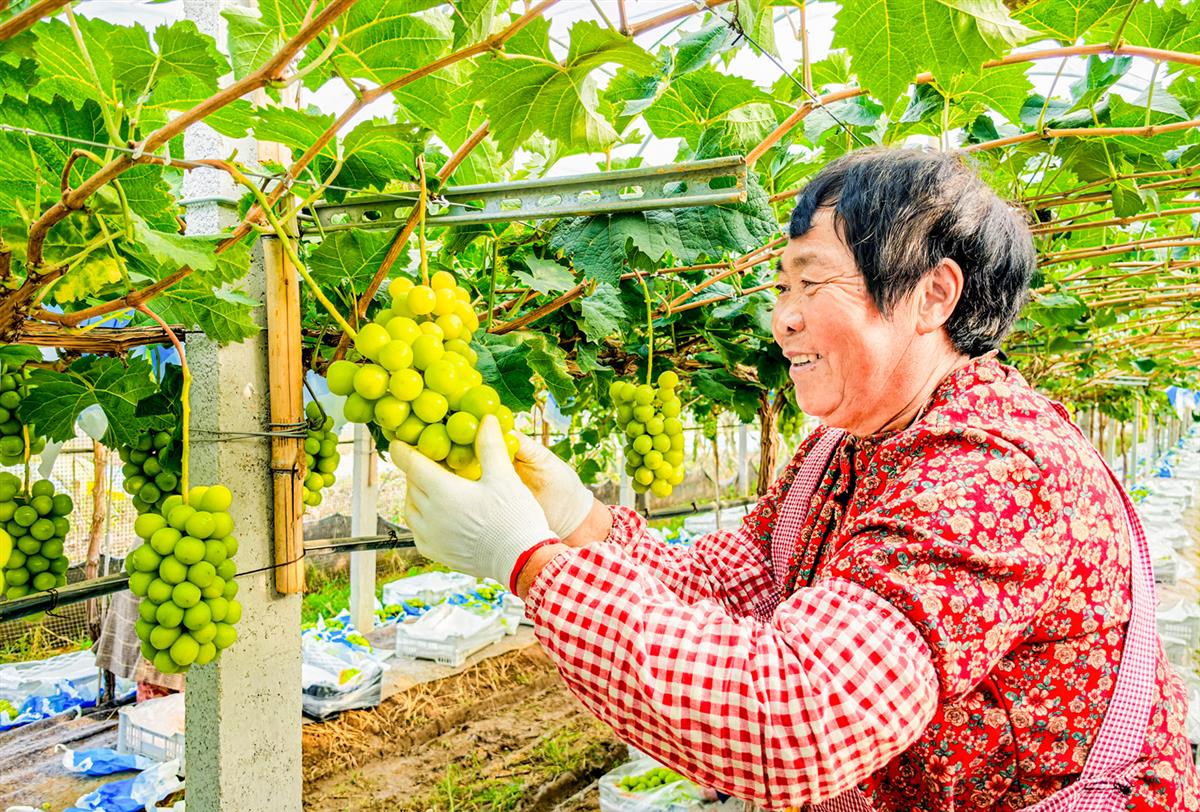 2025年10月16日,山东省烟台市招远市金岭镇大户陈家村。山东招远的葡萄大棚里,藤蔓间垂挂着饱满的阳光玫瑰,农人手捧果串,眉眼间漾着丰收的喜悦。金都大地的乡土生机,在这串串甜润的葡果与朴实的笑容里,化作乡村振兴最鲜活的注脚。