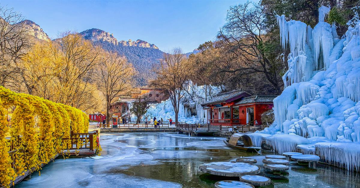 2026年1月24日,济南灵岩寺景区。一侧是冰瀑垂挂的冬日盛景,一侧是明黄藤萝似春日暖阳,冰面与石墩静卧其间,在群山环抱里,演绎着冬与春的温柔相遇。