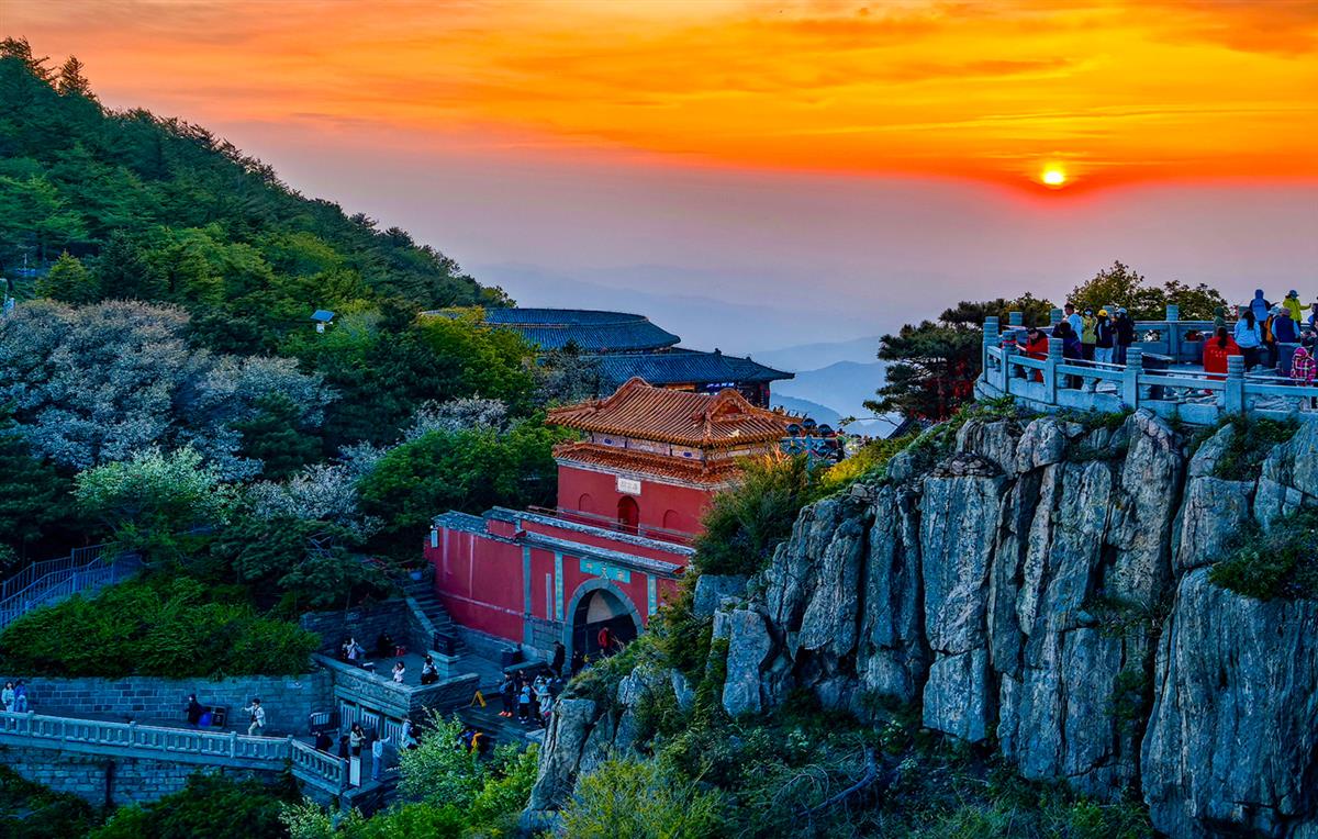2025年5月10日,山东省泰安市泰山景区。傍晚时分,夕阳把橙红的光泼洒在泰山之巅,红墙金瓦的南天门在暮色里格外醒目。悬崖边的观景台挤满了看日落的人,山风里混着草木的清香,让这一刻的岱顶既庄严又温柔。