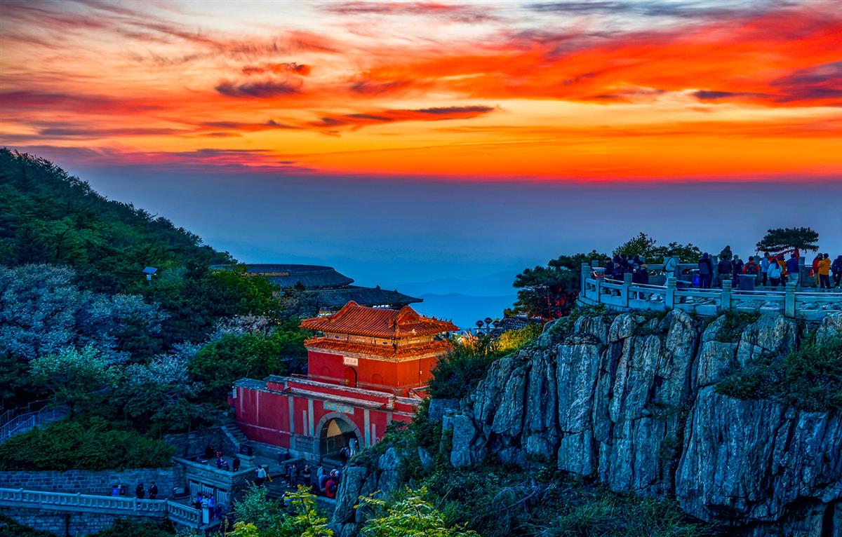 2025年5月10日,山东省泰安市泰山景区。傍晚时分,泰山之巅的天空被晚霞烧得通红,橙红与金黄的云浪翻涌在天际。红墙金瓦的南天门在霞光里愈发厚重庄严,悬崖观景台上的人影静静伫立,沉浸在这壮阔又温柔的山巅暮色里。