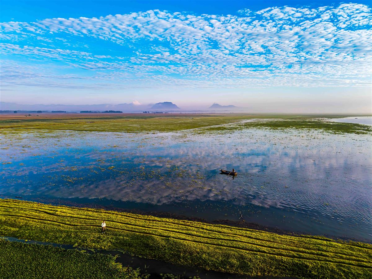2025年8月9日,清晨的滹沱河边云霞满天,一艘小渔舟在河水中划荡,岸边一位年轻女子在喊打鱼的哥哥回家吃早饭,多么美妙的一幅滹沱恋歌