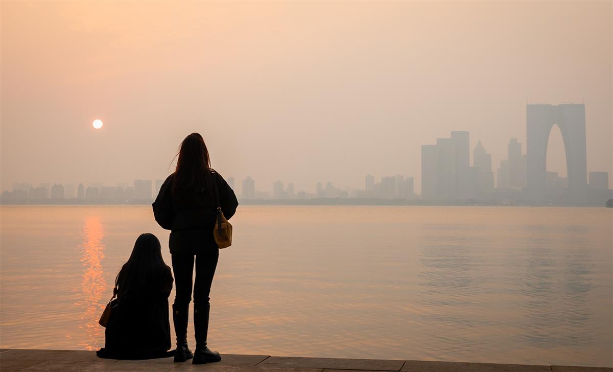 傍晚的金鸡湖,落日吻过湖面,人影与东方之门相映,谱就苏州的暮色小诗。