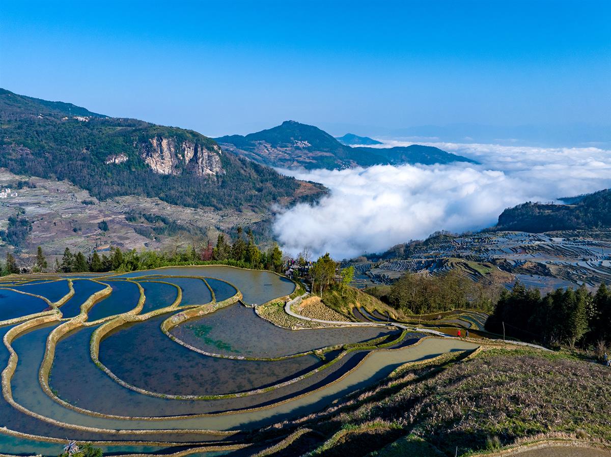 阿者科村的云上梯田,是哈尼人与自然和谐共生的生动写照。云雾时常漫至山腰,海拔 1800 米的云海在 1300 亩彩色梯田上流淌。