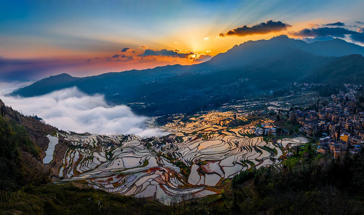 航拍于2025-03-01云南省元阳梯田,元阳梯田位于云南省红河州元阳县的哀牢山南部,是哈尼族人世世代代留下的杰作。航拍著名的多依树日出,日出、云海,丁达尔光,梯田反射着初阳的金红色,村庄也染上橙红色。