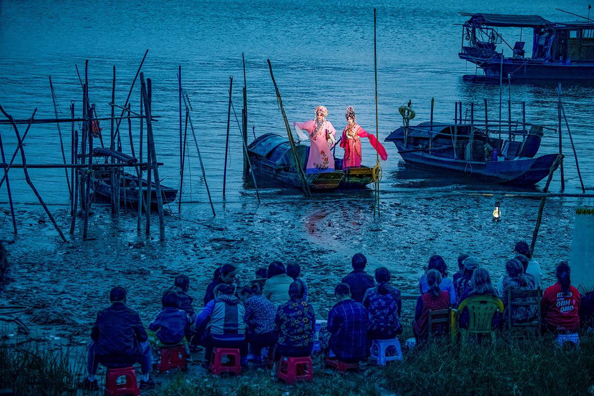 拍摄于广东佛山市三水区渔村,广东非遗粤剧送戏到渔村,深受村民喜爱,丰富了乡村文化生活,村民挑灯看戏。