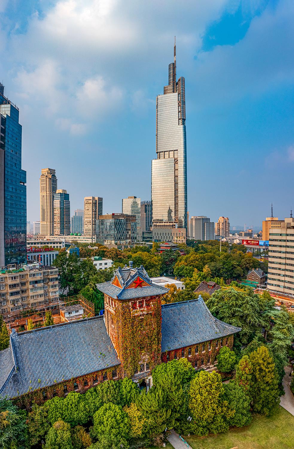 航拍于2022-11-15南京大学鼓楼校区,百廿辉煌,心中永远的丰碑--北大楼!南京城市地标紫峰大厦高耸入云 金碧辉煌,也只能是北大楼的背景,现代建筑与民国老建筑交相辉映。