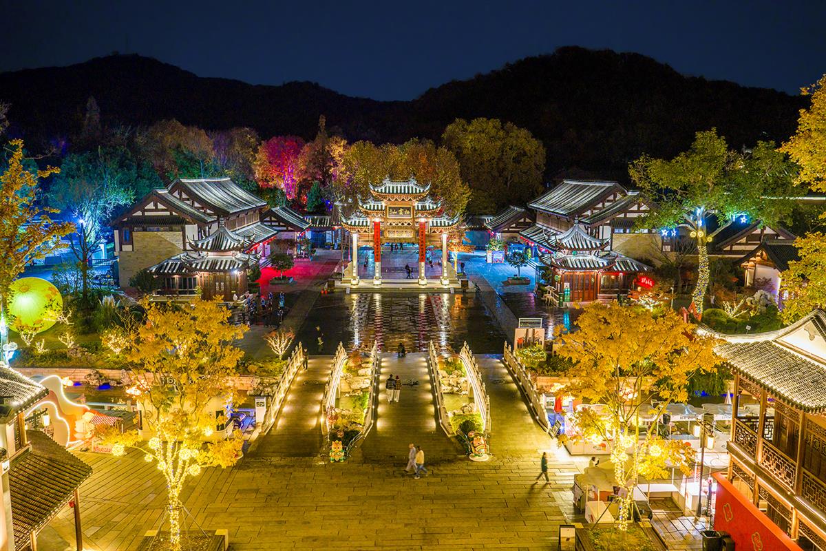航拍于栖霞山风景区,夜晚灯光璀璨美轮美奂。