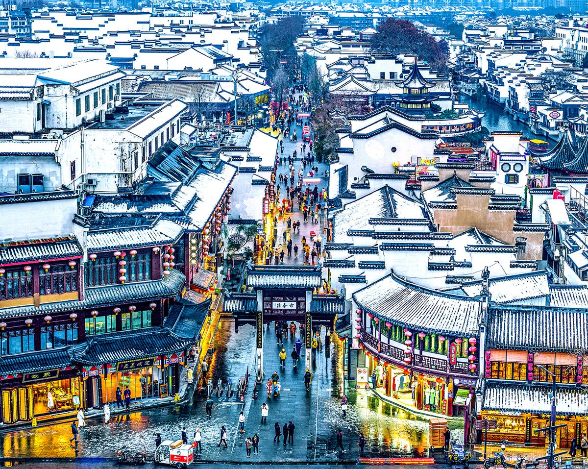 航拍于2023-12-19,一场江南雪,美了金陵城。白雪统一了世间缤纷杂色,夫子庙秦淮风光带再现古韵美,白雪与橘色灯光互为衬映,构成极美的秦淮夜。傍晚时分航拍,雪后夫子庙秦淮河桨声灯影,白雪中闪烁着暖暖的橘色灯光,古秦淮游人如织,熙熙攘攘,人们热爱金陵文化秦淮古韵,宛如一幅雪霁秦淮上河图。