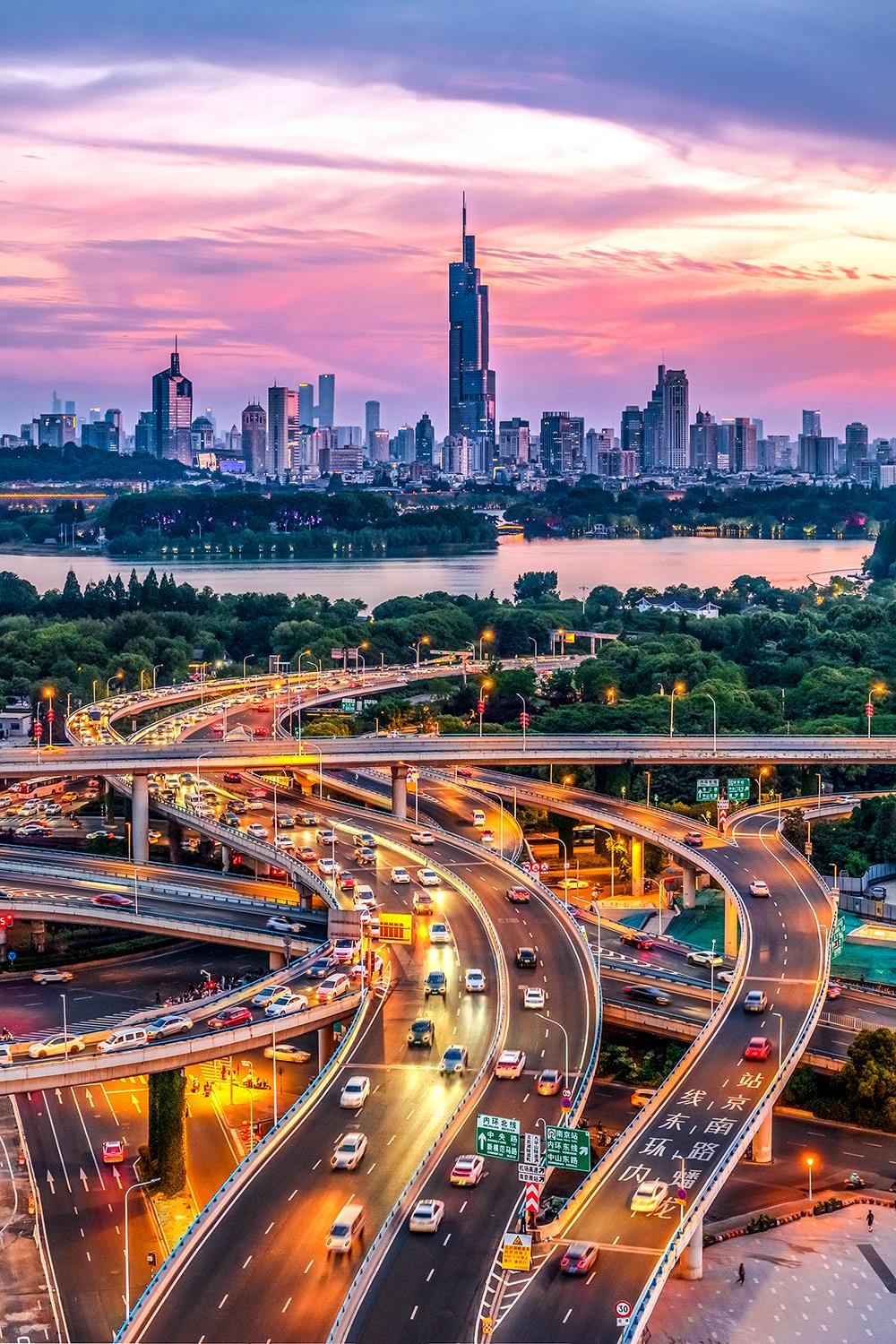 航拍于南京玄武区新庄立交桥,背景为代表南京城市天际线的紫峰大厦,当天晚霞瑰丽,一幅傍晚繁忙而多彩的城市图景。
