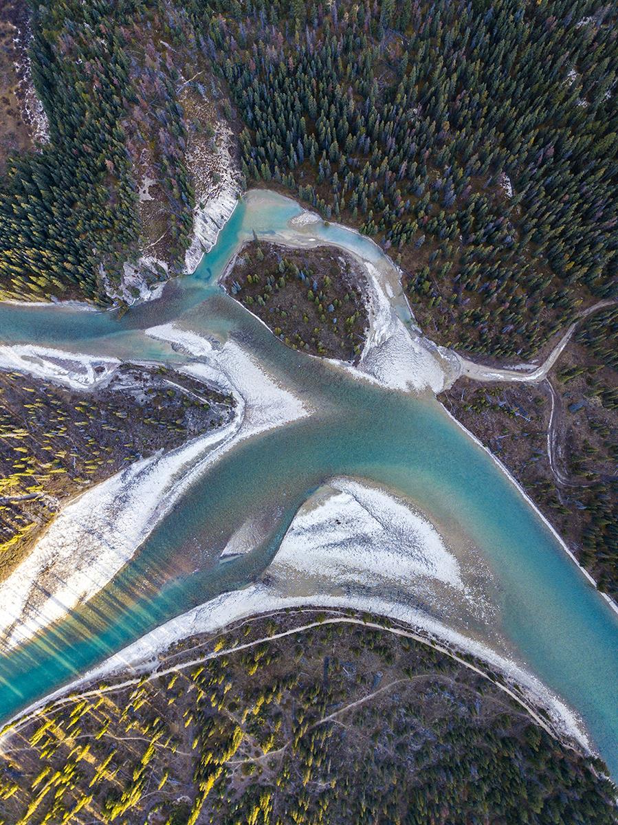 大地航拍,彩色桦树林与河流共绘出一个绿巨人,奔行于大地。