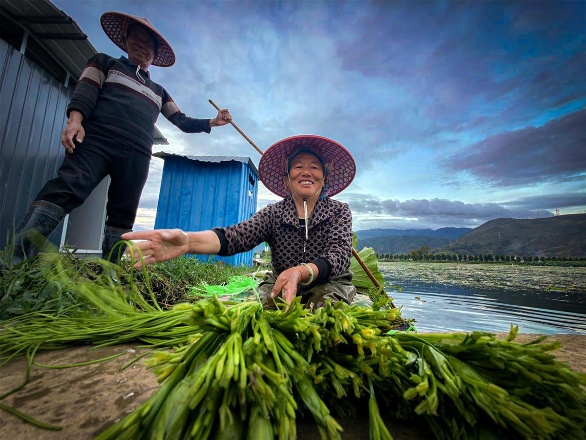 傍晚的湖畔,天色晕开温柔的蓝调,两位农人正忙着收获当日最后一茬水性杨花。刚从湖水里捞起的枝叶还带着凉意,翠绿的色泽在暮色里愈发鲜亮。