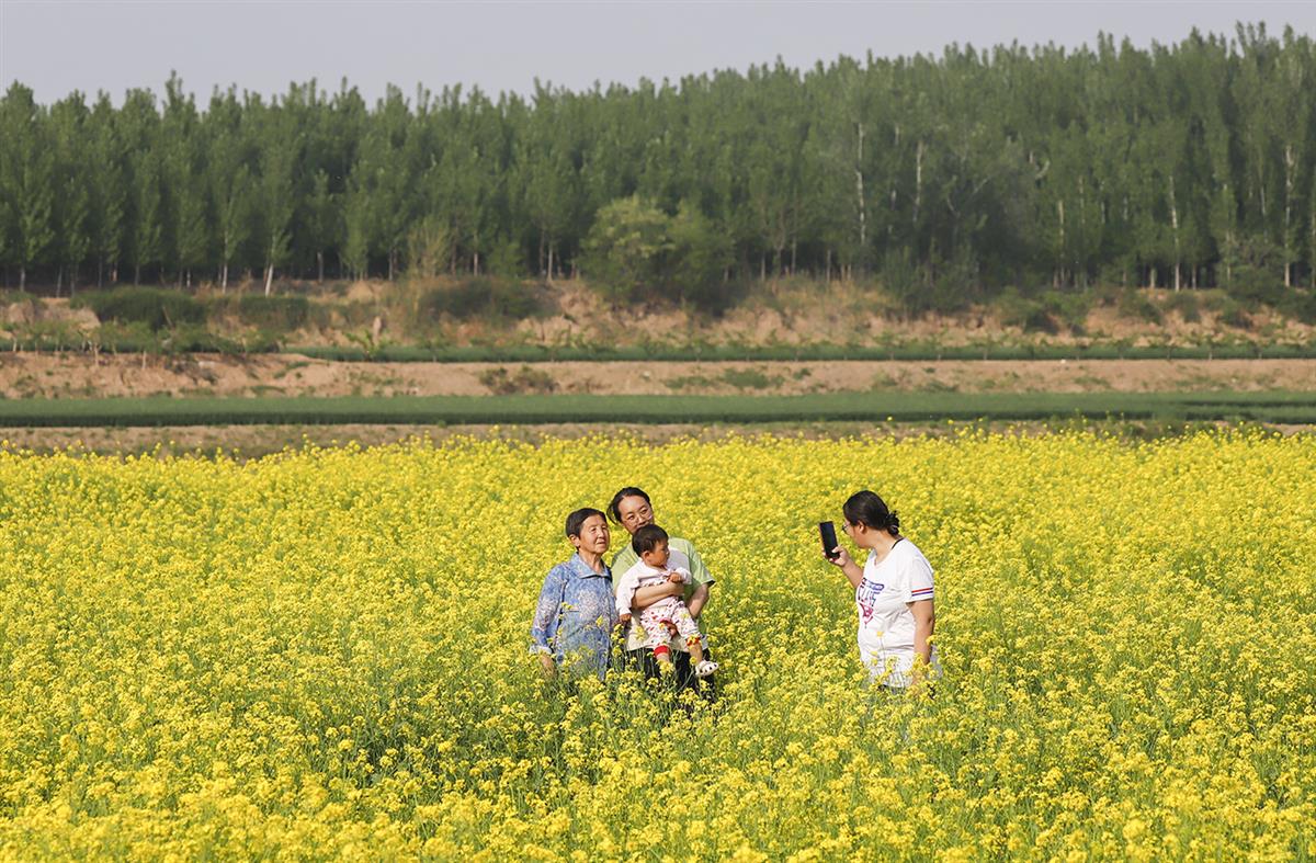 油菜在北方不多见。菜花盛开时一农户在菜田里拍照留念。