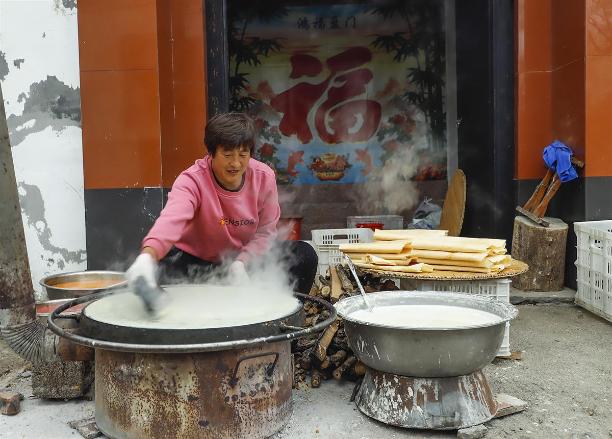 煎饼是当地的特色食品。一农妇在自家门口做起了小生意招徕游客。
