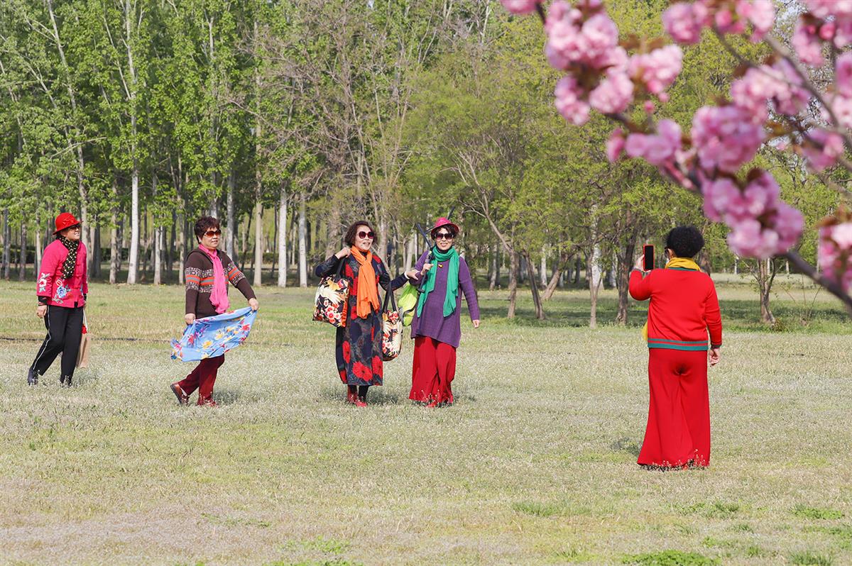 春天的郊外,几名老年人在游玩拍照,享受欢乐时光。