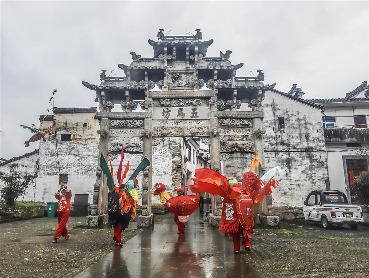 许村保存了大量宋至清代的古建筑群,传承着独特的民俗文化。这是村民在五马坊前表演”斗鸡“。
