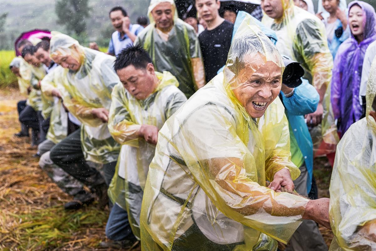 为欢庆“中国农民丰收节”,安徽池州库山村开展了丰富多彩的趣味赛事活动。图为竭尽全力的村民雨中田间拔河场景。