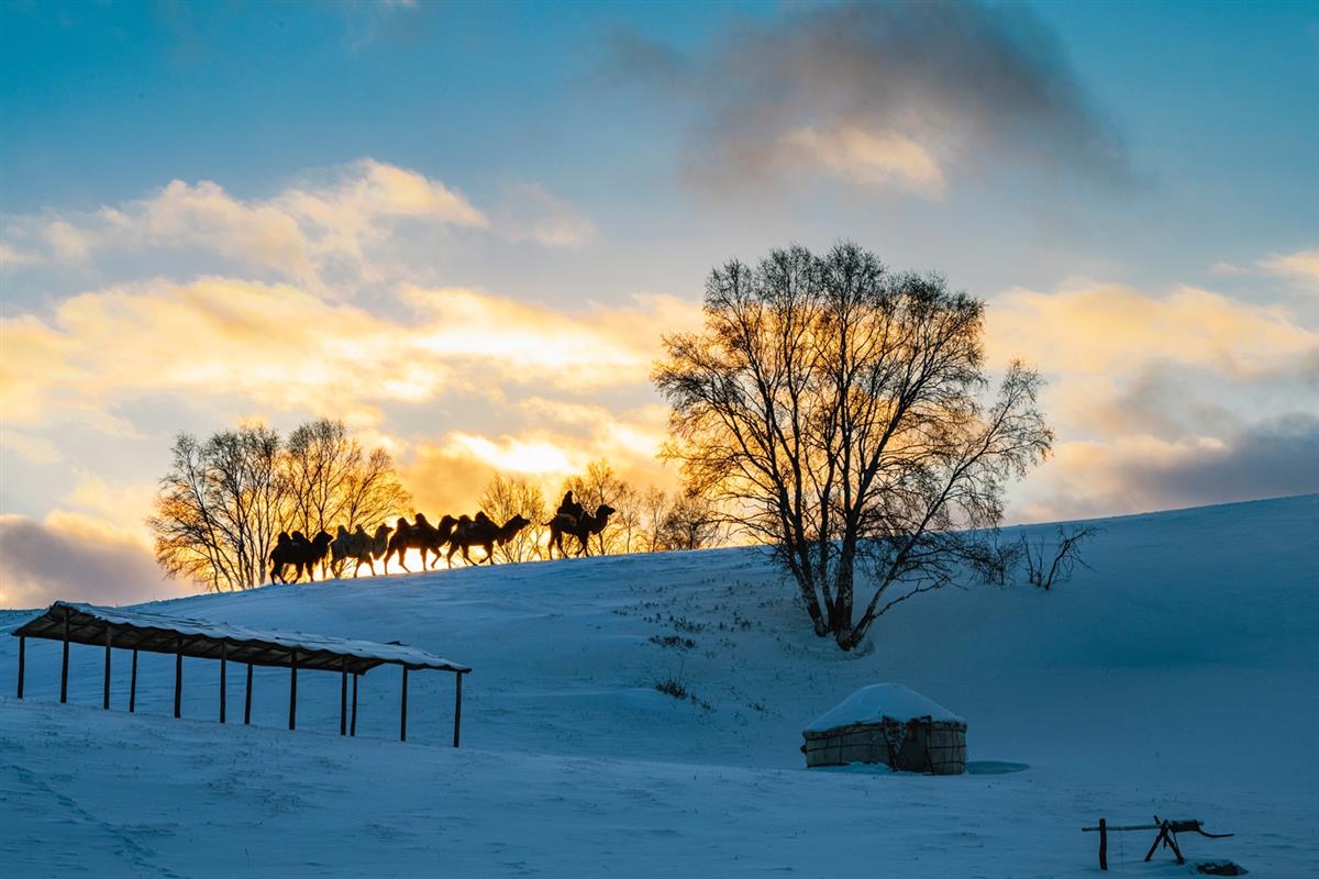 冬季的内蒙古赤峰克什克腾旗乌兰布统草原,一抹晚霞,映衬着牧归的驼影。
