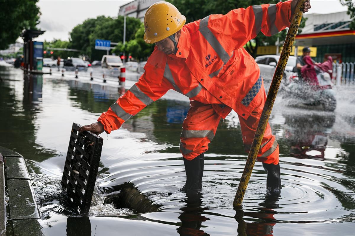 一场暴雨造成了安徽安庆城区道路的严重积水,被称为城市清道夫的环卫工人以坚韧不拔的精神坚守在岗位上, 排涝疏通保畅通。