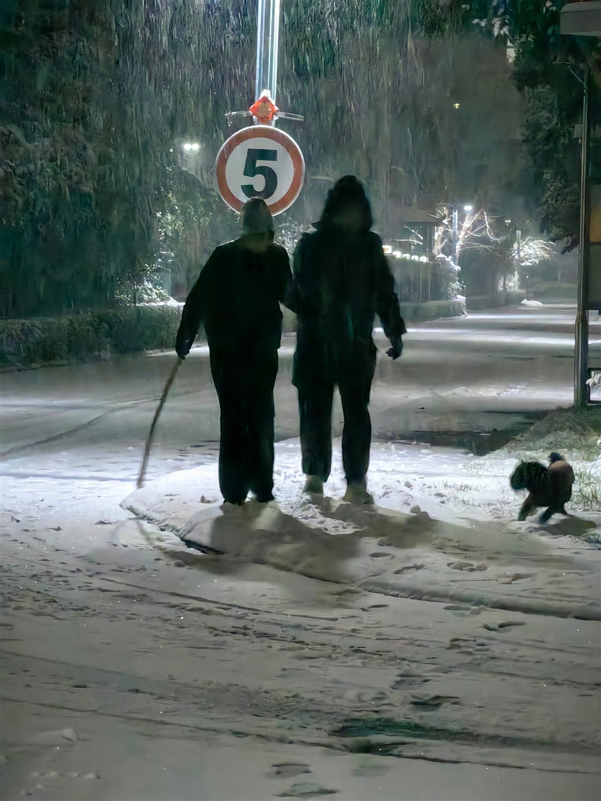 以雪夜街头的背影为核心,借路灯的暖光与纷飞的雪花营造氛围感,用并肩而行相互搀扶的身影与小狗点缀,传递寒夜里相伴的温暖与安宁。