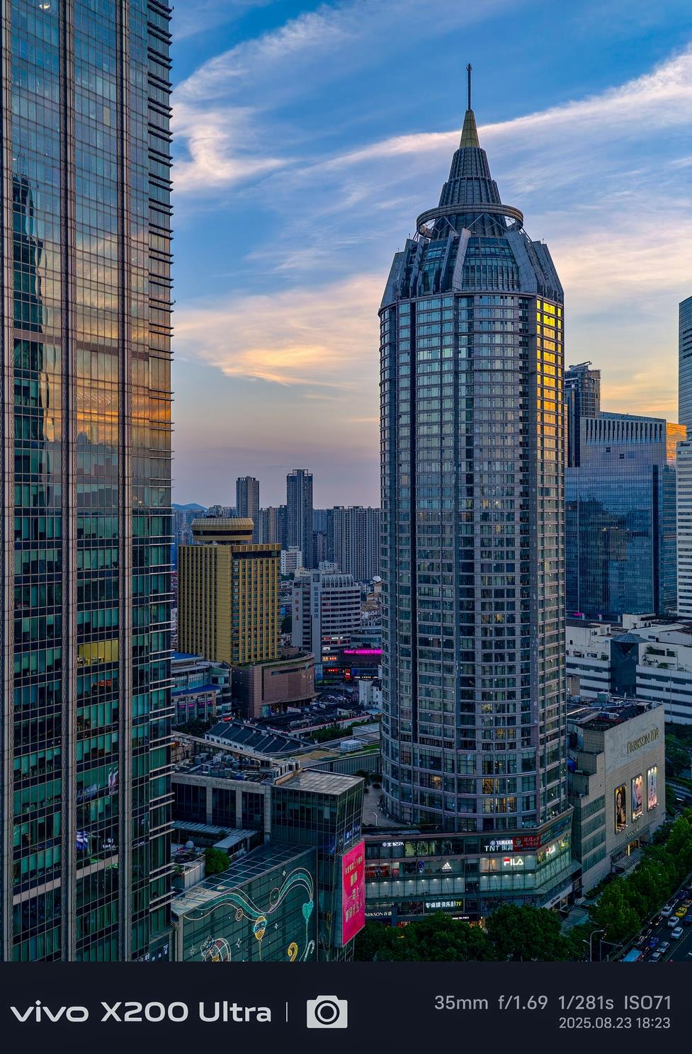 黄昏时分,落日余晖漫过玻璃幕墙,冷硬的建筑肌理被晚晖温柔晕染,明暗交织间,藏尽锡城暮色里的都市诗意。