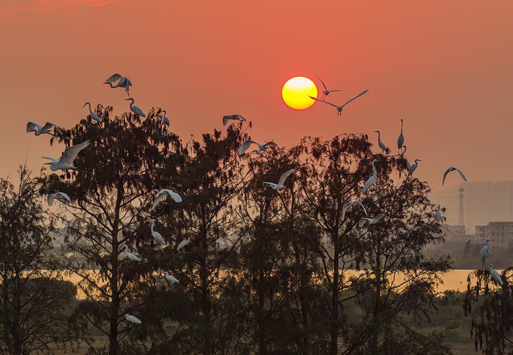 拍摄于广东中山,当最后一抹金辉吻别天际,群鹭或栖于枝头,或振翅归巢,在橙红的天幕下,勾勒出一幅充满生机与诗意的自然画卷。
