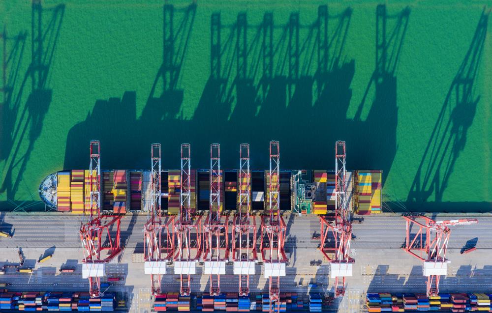 从上帝视角俯瞰,巨大的岸桥如钢铁巨人般整齐排列,将五彩斑斓的集装箱精准地从巨轮搬运到陆地,构成一幅充满力量与秩序的工业画卷。