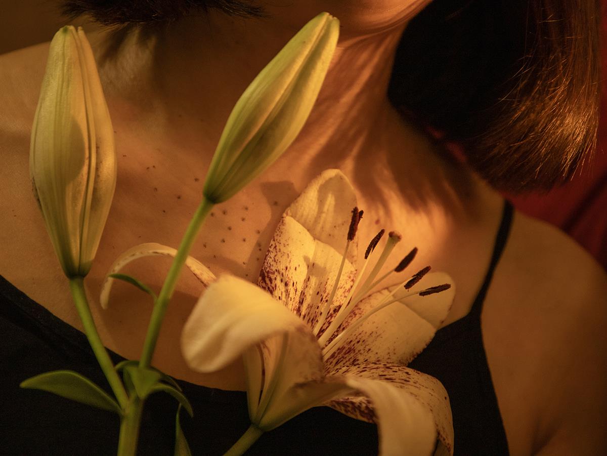 暖光轻覆,百合斜倚在颈侧,花瓣的纹路与肌肤的肌理在光影里交融,光落在花上,也落在人间,勾勒出独属于温柔与浪漫的诗意瞬间。